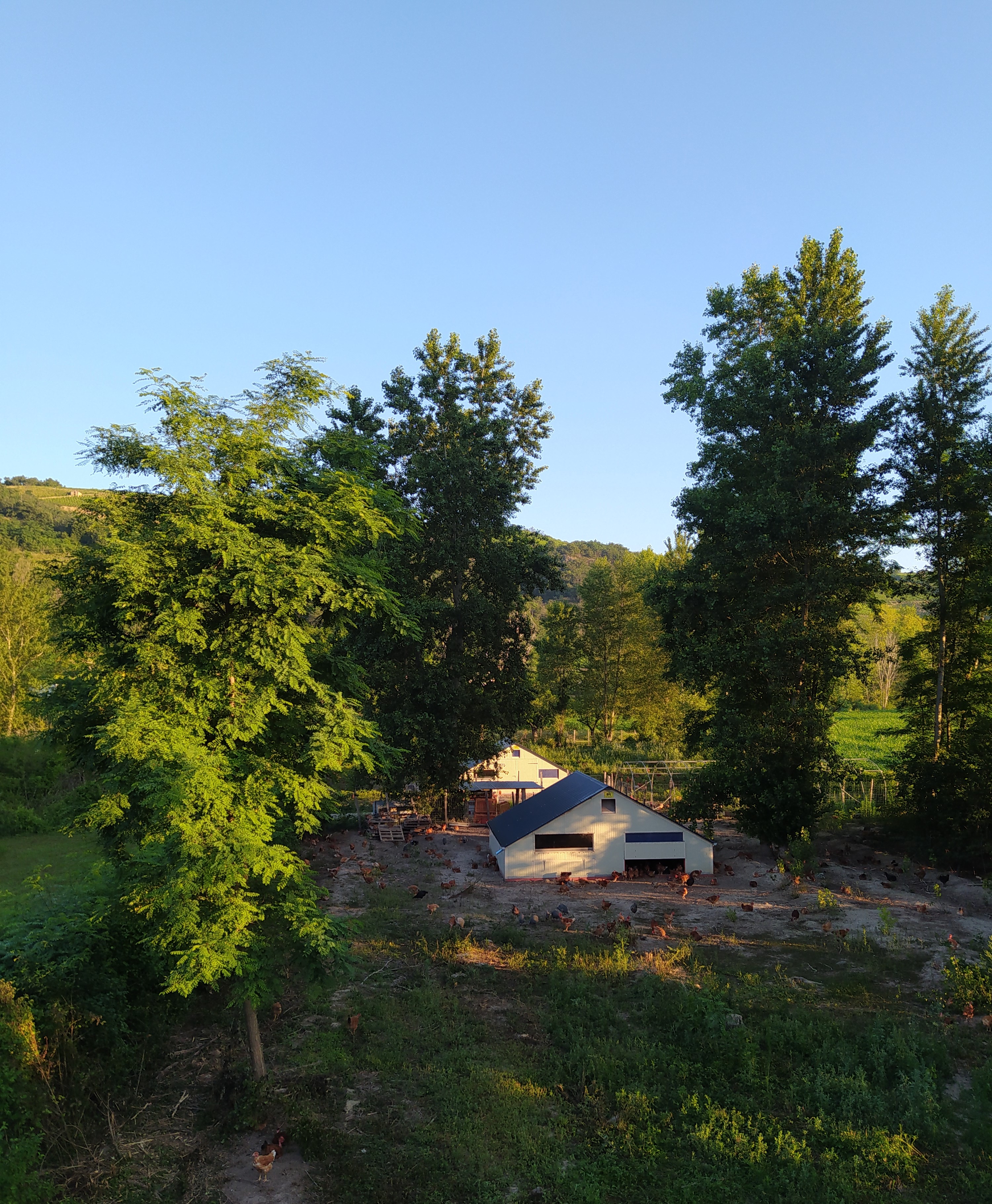 Les pintades et les poulets Les volailles d’Alex sont élevés en plein air (sortent quand elles le souhaitent). Ceci signifie que chaque jour, la trappe de chaque bâtiment est ouverte pour laisser libre circulation aux animaux sur 2500 m² de terrain naturel.